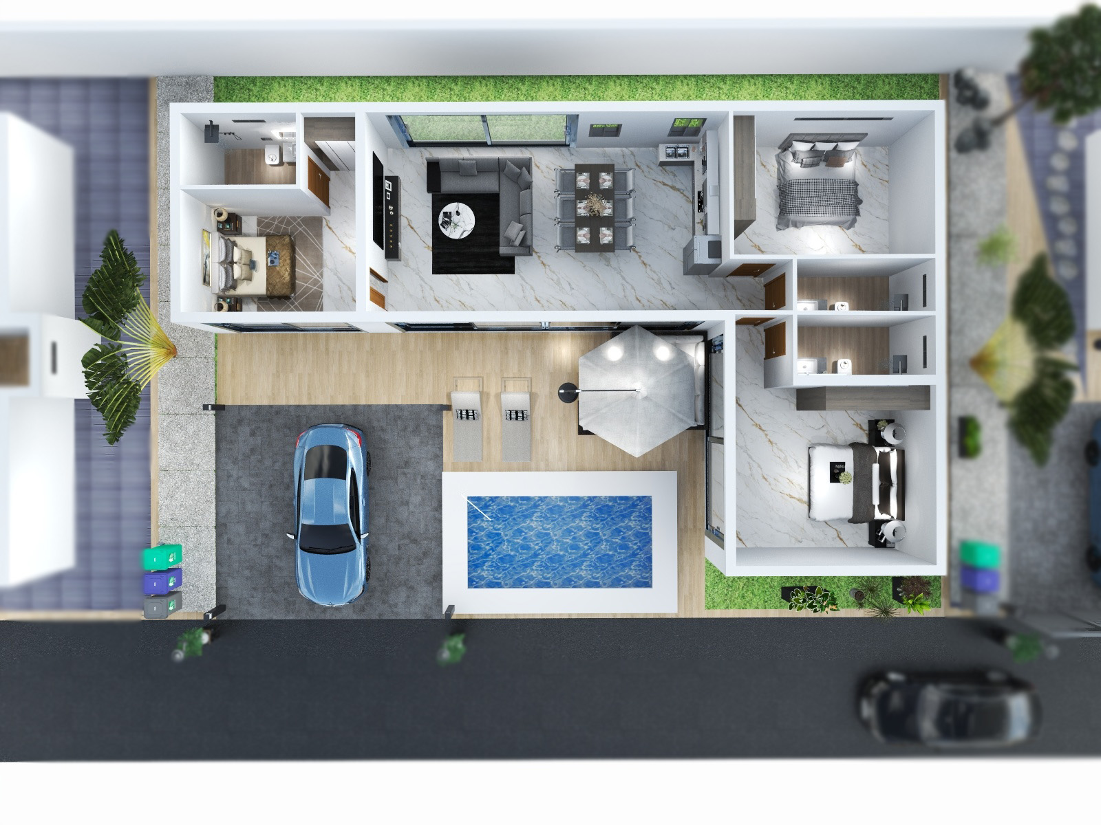 These luxurious villas with a living area of 103 m2 offer an oasis of tranquility, each boasting three spacious bedrooms and three well-equipped bathrooms. Relax in the spacious living room with its contemporary design. Step outside and discover your own private paradise - a sprawling 49 square metre terrace and swimming pool, perfect for cooling off under the Thai sun.